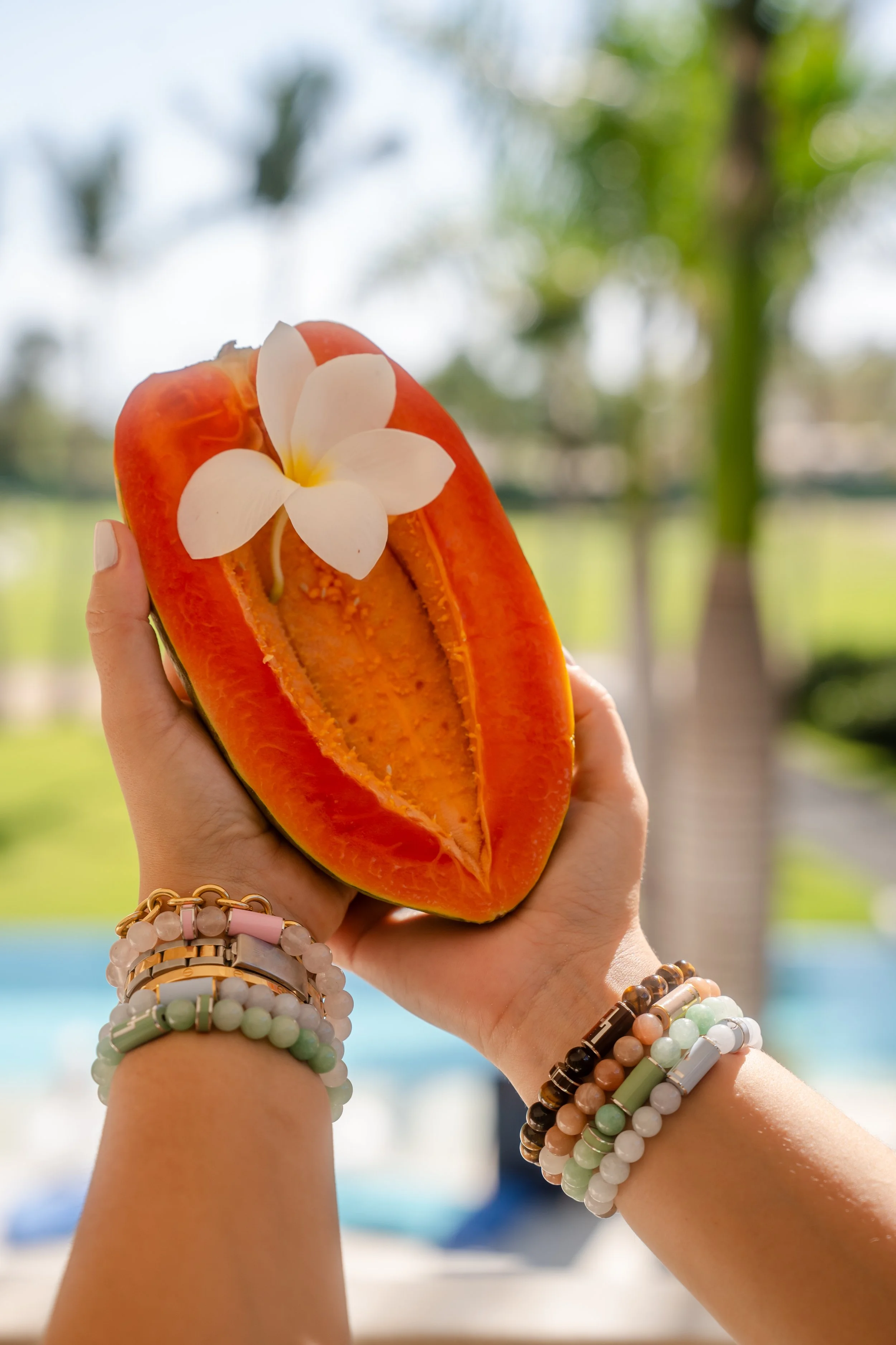 The Levity + Love bracelet comes in 8 different colors so they can be collected and switched out according to your daily look or worn stacked for several goals per day to track. Taking cues from nature, Levity + Love bracelets, are made of natural gemstones from around the world! Our clasps are designed and plated in 18k gold and sterling silver.